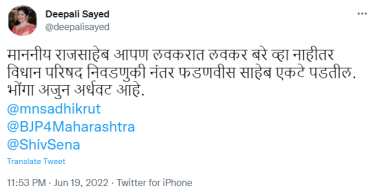 दिपाली यांनी या ट्विटमध्ये स्वत:च्या पक्षासोबतच महाराष्ट्र नवनिर्माण सेना आणि महाराष्ट्र भाजपाचं ट्विटर हॅण्डलही टॅग केलं आहे.
