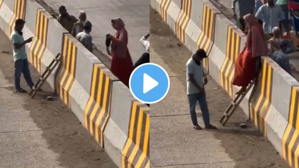 पण, व्हायरल झालेल्या व्हिडीओमध्ये काही वेगळेच पाहायला मिळाले. एक व्यक्ती महामार्गाच्या मध्यभागी रस्तादुभाजकाजवळ दोन शिड्या लावून उभी आहे. यावेळी महामार्गाच्या मधेच गाडीतून उतरणारे लोक त्या शिड्या चढून रस्तादुभाजक ओलांडत आहेत. पण, रस्तादुभाजक ओलांडण्यासाठी म्हणून शिडीचा वापर करणाऱ्या लोकांकडून तो पैसे घेत आहे. अशाने लोकांना कमी मेहनतीत रस्ता ओलांडता येतो; पण यातून ती व्यक्ती मात्र चांगले पैसे कमावतेय. मात्र, अशा प्रकारे रस्ता ओलांडणे जीवघेणे ठरू शकते.