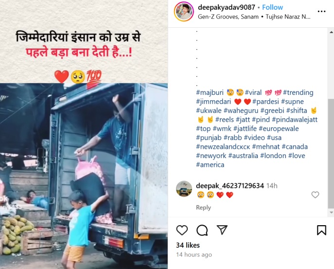 हा व्हायरल व्हिडीओ @deepakyadav9087 या इन्स्टाग्राम अकाउंटवरून शेअर करण्यात आला असून “जबाबदारी माणसाला वयाच्या आधीच मोठं करते” असं कॅप्शन या व्हिडीओला देण्यात आलं आहे.