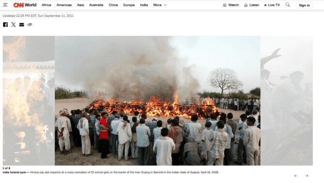 फोटोच्या कॅप्शनमध्ये लिहिले होते की, बुधवारी १६ एप्रिल २००८ रोजी, अहमदाबाद, भारताच्या दक्षिणेस सुमारे १७५ किलोमीटर (१०८ मैल) अंतरावर असलेल्या बोडेलीजवळील बामरोली गावात पंधरा शाळकरी मुलींच्या सामूहिक अंत्यसंस्काराला लोक उपस्थित होते. बुधवारी पहाटे पश्चिम भारतात एक बस सुमारे ५० फूट (१५ मीटर) कालव्यात कोसळली, ज्यामध्ये परीक्षा देण्यासाठी जाणाऱ्या किमान ४१ शाळकरी मुलांचा आणि इतर तीन जणांचा मृत्यू झाला, असे एका अधिकाऱ्याने सांगितले आहे.
