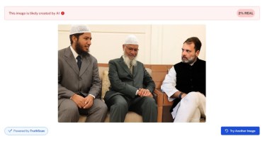 निष्कर्ष : काँग्रेस नेते राहुल गांधी आणि झाकीर नाईक यांचा व्हायरल फोटो बनावट आहे. हा फोटो एआय साधनांचा वापर करून बदलून आणि एडिट करून तयार करण्यात आला आहे.