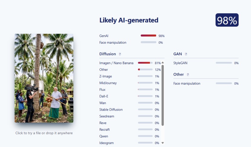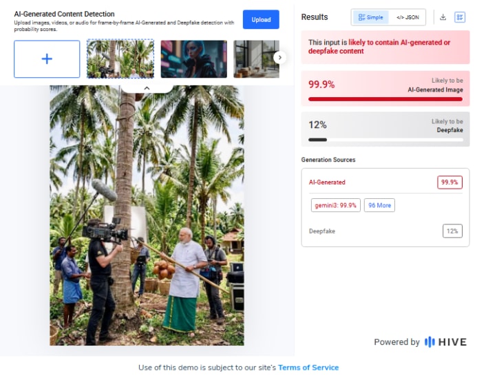 ‘HIVE Moderation’ नुसार, हा फोटो ९९.९% एआय-जनरेटेड असण्याची शक्यता आहे. तसेच, हा फोटो १२ टक्के ‘डीपफेक’ असण्याची शक्यता या विश्लेषणातून समोर आली.