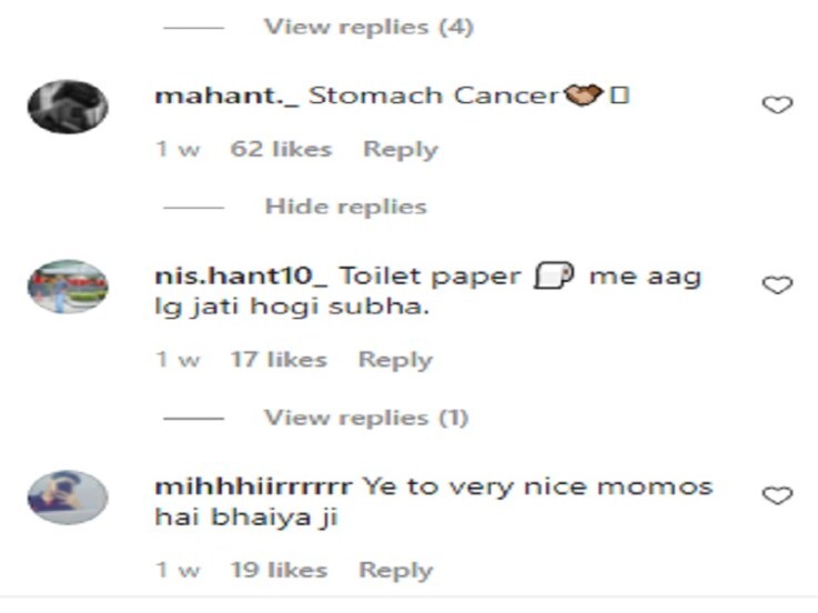 या व्हिडीओला हजारो ९० हजारांपेक्षा जास्त लाइक्स मिळाले असून जवळपास ८० हजारांपेक्षा जास्त व्ह्यूज मिळाले आहेत. पण या व्हिडीओपेक्षाही जास्त मजेदार यावरील कमेंट्स आहेत.एक युजरने कमेंटमध्ये लिहिलं की, “हे फायर मोमोजे खाल्ल्यानंतर उद्या सकाळी तुम्हाला कळेल की काय होतं?” तर दुसर्या व्यक्तीनं लिहिलं, “फायर मोमोज खाल्ल्यानंतर टॉयलेट पेपरला आग लागते.” त्याचवेळी काही युजर्सनी लिहिलं की, “हे खाल्ल्यानंतर पोटाचा कॅन्सर नक्कीच होईल”. यासोबत सोशल मीडियावरील युजर्स फायर मोमोज बनवणाऱ्या व्यक्तीचं कौतुक सुद्धा करत आहेत. कारण या खास प्रकारचे मोमोज बनवून तो बराच चर्चेत आलाय.