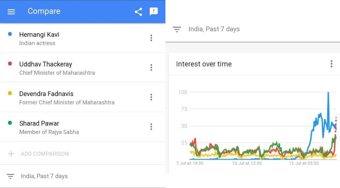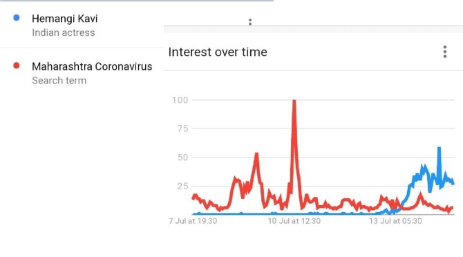 केवळ राजकीय नेतेच नाही सध्याच्या घडामोडींबद्दल बोलायचं झाल्यास महाराष्ट्र करोनाव्हायरस या टर्मपेक्षाही हेमांगी कवीबद्दल अधिक सर्च झाल्याचं गुगल ट्रेण्डच्या आकडेवारीतून स्पष्ट होत आहे.