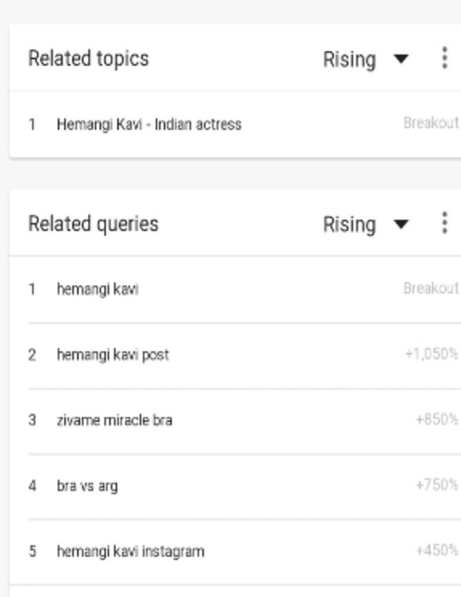 हेमांगीच्या ‘बाई, बुब्स आणि ब्रा’ या पोस्टची चर्चा इतकी आहे की भारतभरामध्ये गुगल ट्रेण्ड्सच्या आकडेवारीत Bra या शब्दाशी संबंधित रिलेटेड सर्चमध्ये हेमांगीबद्दलच्याच टर्म दिसत आहेत. म्हणजे ब्रासंदर्भात सर्च करताना त्याचा थेट संबंध हेमांगीशी जोडून सर्च करणाऱ्यांची आकडेवारी अधिक आहे. ब्रासंदर्भात रिलेटेट क्वेरीजमध्ये हेमांगी कवी, हेमांगी कवी पोस्ट, हेमांगी कवी इन्स्ताग्राम टॉपीक चर्चेत असल्याचं दिसत आहे.