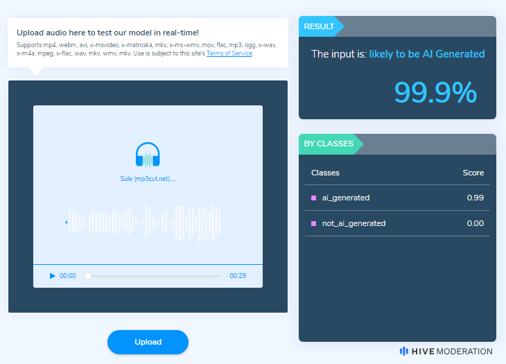 आम्ही तो ऑडिओ AI डिटेक्टर ऑडिओ टूल HIVE मॉडरेशनद्वारेही तपासला.