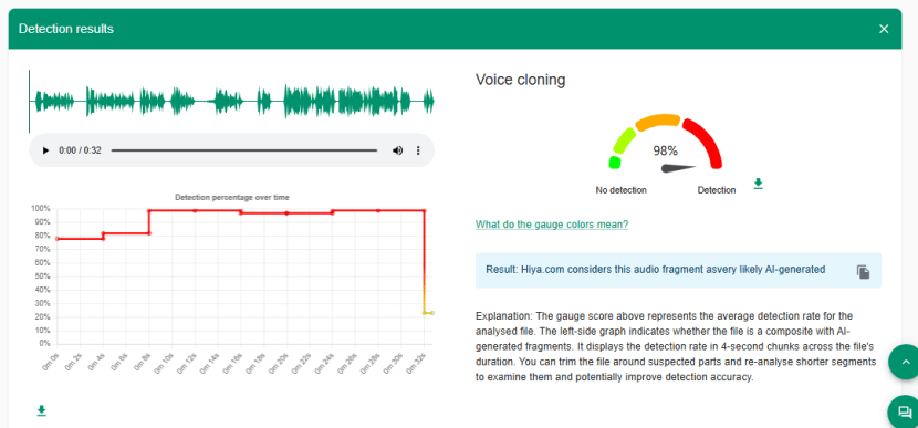 त्यानंतर आम्ही InVid ॲडव्हान्स टूल्समध्ये एम्बेडेड Hiya वापरून ऑडिओचे विश्लेषण केले. यावेळी ऑडिओ विश्लेषणात असे दिसून आले की, त्यातील ९८ टक्के भागाचे ‘व्हॉइस क्लोनिंग’ करण्यात आले आहे.