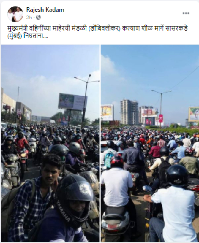 सोशल मीडियावर कल्याण-शीळ मार्गावरील शीळफाटा येथील फोटो मागील काही दिवसांपासून प्रचंड व्हायरल झाला आहे. या फोटोमध्ये नजर जाईल तिथपर्यंत दुचाकीस्वार वाहतूककोंडीत अडकल्याचे चित्र दिसत आहे. हा फोटो फेसबुक, व्हॉट्सअपसारख्या माध्यमांवरुन व्हायरल झालाय. हा फोटो शेअर करत मनसेचे शहराध्यक्ष राजेश कदम यांनी मुख्यमंत्र्यांना तुमच्या सासरच्या लोकांना मुंबईत येताना त्रास होत असल्याचा टोला अप्रत्यक्षपणे लागवाला आहे. “मुख्यमंत्री, वहिनींच्या माहेरची मंडळी (डोंबिवलीकर) कल्याण शीळ मार्गे सासरकडे (मुंबई) निघताना….” अशी कॅप्शन देत कदम यांनी कल्याण-शीळ मार्गावरील वाहतूककोंडीचे फोटो फेसबुकवरुन शेअर केले आहेत.