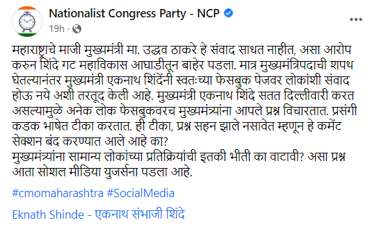 “महाराष्ट्राचे माजी मुख्यमंत्री उद्धव ठाकरे हे संवाद साधत नाहीत, असा आरोप करुन शिंदे गट महाविकास आघाडीतून बाहेर पडला. मात्र मुख्यमंत्रिपदाची शपथ घेतल्यानंतर मुख्यमंत्री एकनाथ शिंदेंनी स्वतःच्या फेसबुक पेजवर लोकांशी संवाद होऊ नये अशी तरतूद केली आहे,” असा टोला राष्ट्रवादी काँग्रेसने लगावला आहे. “मुख्यमंत्री एकनाथ शिंदे सतत दिल्लीवारी करत असल्यामुळे अनेक लोक फेसबुकवरच मुख्यमंत्र्यांना आपले प्रश्न विचारतात. प्रसंगी कडक भाषेत टीका करतात. ही टीका, प्रश्न सहन झाले नसावेत म्हणून हे कमेंट सेक्शन बंद करण्यात आले आहे का?” असंही राष्ट्रवादीने फेसबुक पोस्टमधून विचारलं आहे. “मुख्यमंत्र्यांना सामान्य लोकांच्या प्रतिक्रियांची इतकी भीती का वाटावी? असा प्रश्न आता सोशल मीडिया युजर्सना पडला आहे,” असंही या पोस्टमध्ये म्हटलंय.