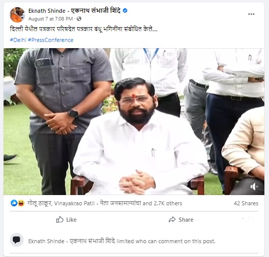 मुख्यमंत्री एकनाथ शिंदे यांच्या फेसबुक पेजवरील फोटो आणि व्हिडीओवर आता युझर्सला त्यांना फॉलो करणाऱ्यांना कमेंट करता येत नाही. मुख्यमंत्री शिंदेंच्या पेजवरील कमेंट सेक्शन बंद करण्यात आलेलं आहे. सर्वात आधी ही बाब सात ऑगस्ट रोजी मुख्यमंत्री दिल्लीमधून पत्रकार परिषद घेत असताना समोर आली. सायंकाळी झालेल्या या पत्रकार परिषदेच्या फेसबुक लाइव्हदरम्यान शिंदेंच्या पेजवरील कमेंट सेक्शन बंद करण्यात आल्याचं दिसून आलं.