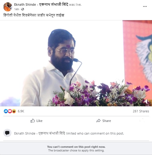 त्यानंतर शिंदेंच्या पेजवरुन पोस्ट होणाऱ्या कोणत्याही पोस्टवर लोकांना कमेंट करता येत नसल्याचं दिसून आलं. यामध्ये अगदी जयंती किंवा विशेष दिनासंदर्भातील पोस्ट असतील, लाइव्ह व्हिडीओ असतील किंवा इतर कोणत्याही पोस्टवर फॉलोअर्सला केवळ रिअॅक्ट आणि शेअर हे दोनच पर्याय उपलब्ध आहेत. काल हिंगोलीमध्ये झालेल्या सभेच्या लाइव्ह वेबकास्टदरम्यानही कमेंट सेक्शन बंद होतं. एकनाथ शिंदे यांच्या पेजवरुन कमेंट सेक्शन बंद करण्यात आल्याचा मेसेज पोस्टखाली दाखवला जात आहे.