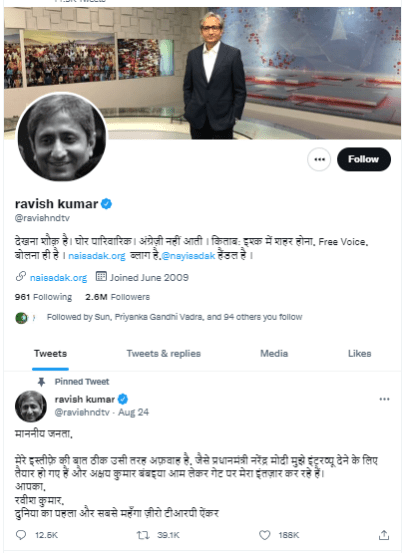 रवीश कुमार यांनी अगदी खोचक पद्धतीने त्यांच्या राजीनाम्यासंदर्भातील चर्चांबद्दल ट्वीट केलं आहे. यामध्ये त्यांनी पंतप्रधान नरेंद्र मोदींचाही उल्लेख केला आहे. “माननीय जनता, पंतप्रधान नरेंद्र मोदी मला मुलाखत देण्याची जशी अफवा उठली होती तशीच सध्या माझ्या राजीनाम्याची अफवा पसरली आहे. मोदी मला मुलाखत देण्यासाठी तयार झाले असून अक्षय कुमार माझ्या घराच्या दाराशी आंबे घेऊन वाट पाहत असल्याची अफवा उठली होती तसाच हा प्रकार आहे,” असा टोला रवीश कुमार यांनी लगावला आहे. “तुमचा रवीश कुमार, जगातील पहिला सर्वात महागडा शून्य टीआरपी असणारा वृत्तनिवेदक आहे,” असंही त्यांनी ट्वीटच्या शेवटी म्हटलं आहे. रवीश यांनी हे ट्वीट आपल्या प्रोफाइलवर पीन टू टॉप करुन ठेवलं आहे. म्हणजेच त्यांच्या प्रोफाइलवर जाणाऱ्या प्रत्येक व्यक्तीला त्यांच्या नव्या ट्वीटऐवजी हेच ट्वीट आधी दिसेल.
