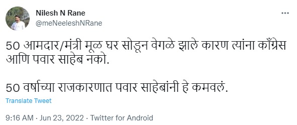 मुख्यमंत्री उद्धव ठाकरेंनी बुधवारी फेसबुक लाइव्हवरुन जनतेशी संवाद साधल्यानंतरही शिंदे समर्थक आमदारांची संख्या वाढतानाचं चित्र दिसत आहे. दादरचे सदा सरवणकर, मंगेश कुडाळकरही रात्रीपासून संपर्कात नसून हे आमदार सुद्धा शिंदेंसोबत गुवहाटीमध्ये असल्याचं दुपारपर्यंत स्पष्ट झालं. मात्र सकाळी ही बातमी समोर आल्यानंतर, आज सकाळी निलेश राणेंनी शरद पवारांवर निशाणा साधलाय. “५० आमदार तसेच मंत्री मूळ घर सोडून वेगळे झाले कारण त्यांना काँग्रेस आणि पवार साहेब नको,” असं ट्विट निलेश राणेंनी केलंय. पुढच्याच वाक्यामध्ये निलेश राणेंनी, “५० वर्षांच्या राजकारणामध्ये पवार साहेबांनी हे कमवलं,” असं म्हटलं आहे.