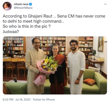 नितेश राणेंनी २१ फेब्रुवारी २०२० मध्ये दिल्लीत सोनिया गांधीचं निवासस्थान असणाऱ्या १० जनपथ येथे झालेल्या भेटीचा फोटो पोस्ट करत संजय राऊत यांच्यावर टीका केलीय. “गजनी राऊत यांच्या सांगण्यानुसार शिवसेनेचे मुख्यमंत्री कधीच हायकमांडला भेटण्यासाठी दिल्लीला आले नाहीत. मग या फोटोमध्ये कोण आहे? जुडवा?”, अशा कॅप्शनहीत नितेश राणेंनी फोटो पोस्ट केलाय. या फोटोत मध्यभागी सोनिया गांधी उभ्या असून त्यांच्या एका बाजूला तत्कालीन मुख्यमंत्री उद्धव ठाकरे आणि त्यांचे पुत्र आदित्य ठाकरे उभे आहेत. ठाकरे पिता-पुत्र सोनिया गांधींच्या भेटीदरम्यान त्यांना पुष्पगुच्छ देताना काढलेला हा फोटो आहे.