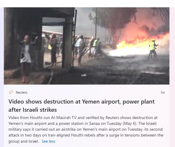 या अहवालात म्हटले आहे की : हुथीसंचालित अल-मसिरा टीव्हीवरील व्हिडीओ आणि रॉयटर्सने पोस्ट केलेला व्हिडीओ मंगळवारी (६ मे) येमेनच्या मुख्य विमानतळावर आणि साना येथील एका वीज केंद्रावर झालेल्या विनाशाचे दर्शन घडवतो. इस्रायली सैन्याने म्हटले आहे की, त्यांनी मंगळवारी येमेनच्या मुख्य विमानतळावर हवाई हल्ला केला, इस्रायल आणि इराण-संलग्न हुथी बंडखोरांमधील तणाव वाढल्यानंतर दोन दिवसांत झालेला हा दुसरा हल्ला आहे.