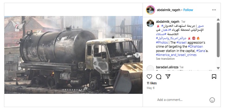 कॅप्शनमध्ये असे सुचवण्यात आले होते की, “राजधानीतील #صنعاء पॉवर प्लांटवर इस्रायली आक्रमणाला लक्ष्य करण्याचा गुन्हा #ذهبان