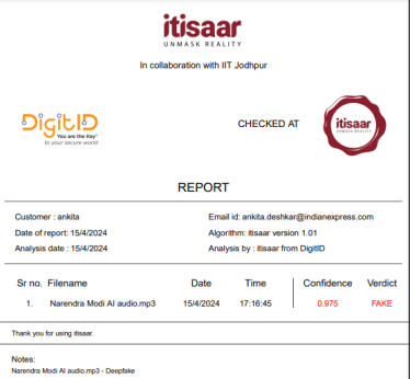 यावरून असे लक्षात आले की, ऑडिओ AI निर्मित असू शकतो. आम्ही हा ऑडिओ IIT जोधपूरच्या टीमने विकसित केलेल्या itisaar.ai या दुसऱ्या AI डिटेक्टरवर अपलोड केला. टूलमुळे हे समजले की हा एक डीपफेक ऑडिओ आहे.