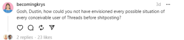 दरम्यान हे प्रकरण तापताना दिसल्यावर डस्टिनने पुन्हा स्पष्टीकरण देत लिहिले की, एकतर पहिली गोष्ट मी मेटामध्ये काम करत नाही. दुसरी गोष्ट म्हणजे तुम्हाला फक्त पॉर्न बॉट्सचं दिसणं आणि कधी कधी पॉर्न बॉट्स दिसणं यात फरक आहे, मी पहिल्या प्रकारच्या लोकांना माहिती दिली होती.