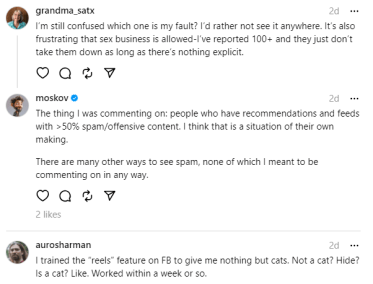दुसरीकडे, लोकांनी या पोस्ट्सवर कमेंट्स करून असेही सांगितले की, इथे आपली चर्चा चालू असताना आम्ही पॉर्न बॉट्स असा शब्द लिहिल्यावर पण आता आम्हाला तशा पोस्ट दिसू लागल्या आहेत. दरम्यान, काहींनी याबाबत उपाय सांगताना लिहिले की, “मी रील्स आणि पोस्टचं गणित असं सेट केलं आहे की मला जे पाहायचं असतं तेच दिसतं, जसं की मला मांजरीचे व्हिडीओ पाहायचे तर मी फक्त मांजरीचेच व्हिडीओ लाईक करते. पॉर्न बॉट्स वगैरे दिसले की थेट ब्लॉक करायचे, तुम्ही तीन वेळा एखाद्या प्रकारची पोस्ट रिपोर्ट किंवा ब्लॉक केली तर ती कदाचितच तुम्हाला परत दाखवली जाईल.” तर काहींनी यावर असंही म्हटलंय की, “आम्ही अनेकदा रिपोर्ट करूनही आम्हाला अशाच प्रकारच्या पोस्ट्स दाखवतात कारण त्या कदाचित त्यांच्यासाठी अश्लील किंवा मर्यादेच्या बाहेर वाटत नाहीत.”