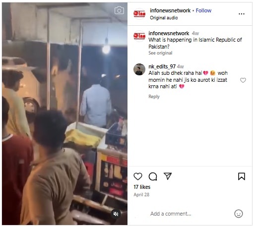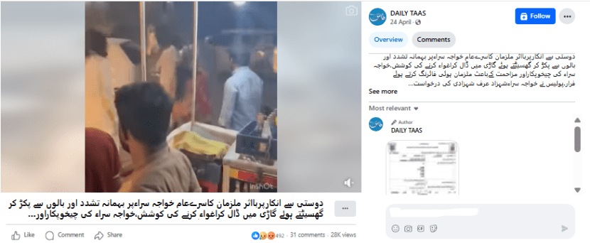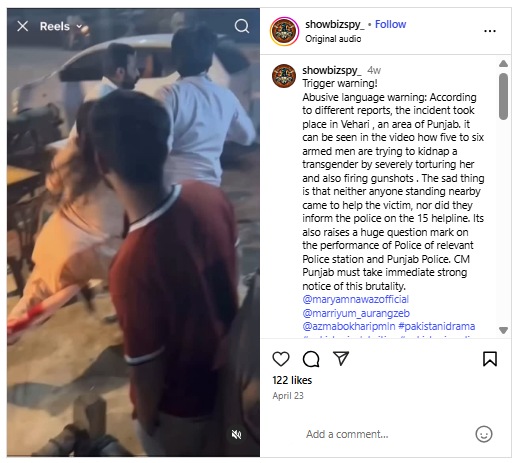 कॅप्शनमध्ये असे म्हटले आहे (अनुवादित) : मैत्री करण्यास नाकार दिल्याने काही संशयितांनी एका ट्रान्सजेंडर महिलेवर क्रूरपणे अत्याचार केले आणि तिचे केस पकडून तिला गाडीत कोंबून तिचे अपहरण करण्याचा प्रयत्न केला. ट्रान्सजेंडर महिला जोरजोरात ओरडल्यामुळे आणि तिने प्रतिकार केल्यामुळे संशयितांनी गोळीबार करत पळ काढला. ट्रान्सजेंडर महिला शहजाद ऊर्फ शहजादीच्या विनंतीवरून पोलिसांनी गुन्हा दाखल केला, परंतु संशयितांना अद्याप अटक करण्यात आलेली नाही. ही दुर्दैवी घटना दानिवाल पोलिस ठाण्याच्या हद्दीतील वेहारी येथे घडली आहे.