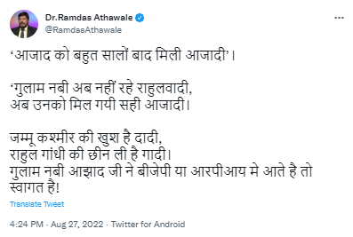 संघटनात्मक बदल करण्याबरोबरच पक्ष कार्यकर्त्यांसाठी पूर्णवेळ उपलब्ध अध्यक्ष नियुक्त करण्याची मागणी ‘जी-२३’ गटाने केली होती. सोनिया गांधी यांना ऑगस्ट २०२० मध्ये लिहिलेल्या पत्रानंतर बंडखोर गटाचा पक्षांतर्गत संघर्ष सुरू होता. या गटाचे म्होरके असलेले आझाद यांनी काँग्रेसमधून बाहेर पडलेल्या अन्य नेत्यांप्रमाणे राहुल गांधींच्या कार्यपद्धतीवर उघड नाराजी व्यक्त करून अखेर पक्षाला सोडचिठ्ठी दिली. याच घडामोडीवर आठवले यांनी त्यांच्या ट्विटर हॅण्डलवरुन एक चारोळी शेअर केली आहे.