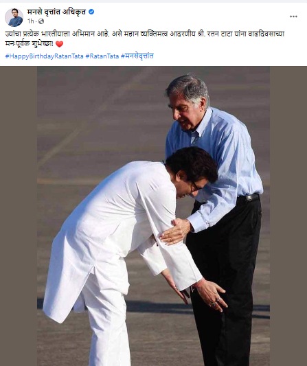 मनसेच्या ‘मनसे वृत्तांत अधिकृत’ या व्हेरिफाइड फेसबुक पेजवरुन रतन टाटांच्या वाढदिवसानिमित्त खास पोस्ट शेअर करण्यात आली आहे. या पोस्टमध्ये राज ठाकरे रतन टाटांच्या पाया पडतानाचा दिसत आहेत. तर रतन टाटा राज यांच्या खांद्याला धरुन त्यांनी केलेला नमस्कार स्वीकारत आहेत. राज आणि टाटांचा हा जुना फोटो शेअर करत मनसेनं, “ज्यांचा प्रत्येक भारतीयाला अभिमान आहे, असे महान व्यक्तिमत्व आदरणीय रतन टाटा यांना वाढदिवसाच्या मनःपूर्वक शुभेच्छा,” असं म्हणत शुभेच्छा दिल्यात. या वाक्याच्या शेवटी मनसेंन हार्टचा इमोजीही वापरला आहे.