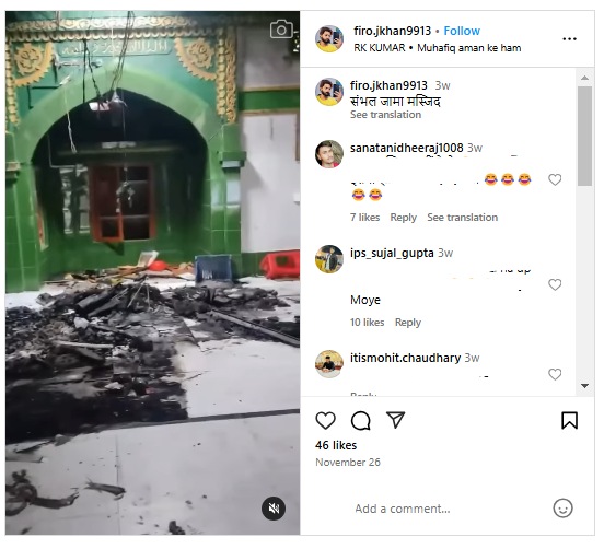 इन्स्टाग्राम युजर firo.jkhan9913 ने हा व्हिडीओ त्याच्या अकाउंटवरून शेअर केला असून, तो संभल येथील जामा मशिदीचा असल्याचा दावा केला आहे.