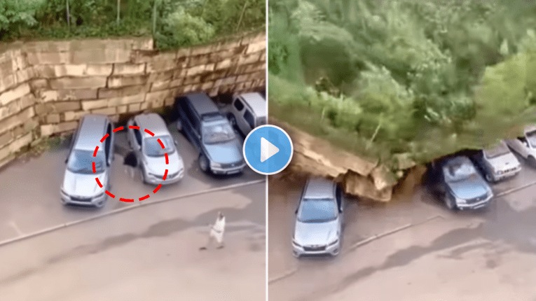 सोशल मीडियावर व्हायरल झालेल्या हा धक्कादायक व्हिडीओ पाहून अनेकांना आश्चर्याचा धक्का बसला आहे. या व्हिडीओमध्ये संरक्षक भिंतीच्या पुढे अनेक गाड्या पार्क केलेल्या दिसत आहेत; पण ही भिंत ढासळत आली असून, कधीही कोसळेल अशा अवस्थेत दिसतेय. परंतु, तरीही घाबरून न जाता एका माणसानं वेळीच योग्य निर्णय घेतला आणि आपली कार तिथून काढली. पण, त्याच वेळेस दुसरा माणूस तिथे फक्त उभा राहून बघत राहिला. त्यानं मात्र वेळीच योग्य निर्णय घेतला नाही आणि दुसऱ्याच क्षणी भिंत कोसळून, तेथील सगळ्या गाड्या भिंतीखाली दबल्या गेल्या.