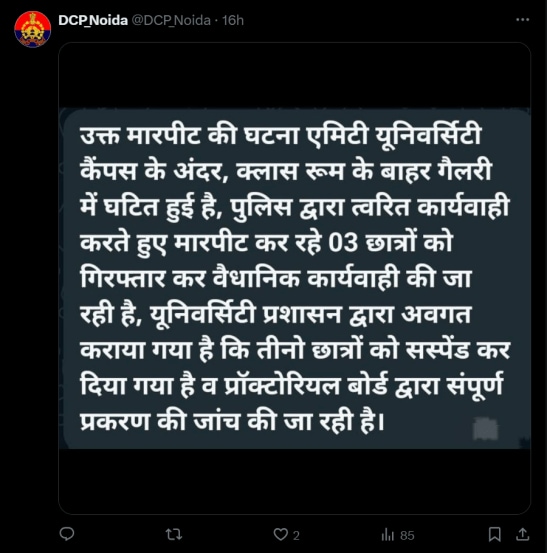 पोलिसांनी सांगितले की, “भांडणाची घटना एमिटी युनिव्हर्सिटी कॅम्पसमध्ये, वर्गाबाहेरील गॅलरीत घडली. पोलिसांनी तत्परतेने कारवाई करत, भांडणात सहभागी असलेल्या तीन विद्यार्थ्यांना अटक केली असून, कायदेशीर कारवाई सुरू आहे. तीनही विद्यार्थ्यांना निलंबित करण्यात आल्याची माहिती विद्यापीठ प्रशासनाने दिली आहे आणि प्रॉक्टोरियल बोर्ड या प्रकरणाची संपूर्ण चौकशी करत आहे.”