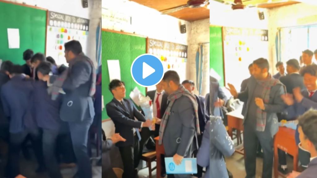 Viral Video : शाळा हा प्रत्येकाची आयुष्यातील सुंदर काळ आहे. सोशल मीडियावर शाळेचे, विद्यार्थी आणि शिक्षकांचे व्हिडीओ व्हायरल होत असतात. हे व्हिडीओ पाहून अनेकदा शाळेची आठवण येते. सध्या असाच एक व्हिडीओ व्हायरल होत आहे. या व्हिडीओमध्ये विद्यार्थी गुरुजींना अनोख्या पद्धतीने वाढदिवसाचं सरप्राइज देताना दिसत आहे.हा व्हिडीओ पाहून तुम्हीही भावूक व्हाल काही लोकांना त्यांच्या शाळेची किंवा गुरूजींची आठवण येऊ शकते.