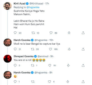 हर्ष यांच्या या ट्वीटवर तृणमूल काँग्रेसचे नेते आणि माजी क्रिकेपटू किर्ती आझाद यांनी रिप्लाय केला. “सुष्मिताचं काय होणार हे तर ठाऊक नाही. मात्र भारताचं जे काही होत आहे त्याची आपल्या सर्वांना कल्पना आहे,” असं किर्ती यांनी ट्वीट केलं. त्यावरही हर्ष यांनी एक भन्नाट रिप्लाय करत, “मोदींनी यंदा बंगालवर विजय मिळवला,” असं म्हटलं. या ट्वीटमधून हर्ष यांनी सुष्मिता बंगाली असून मोदी यांच्या प्रेमात असल्याचं सूचक वक्तव्य करतानाच राजकीय पार्श्वभूमीवरही पश्चिम बंगालमधील प्रमुख पक्ष असणाऱ्या तृणमूलच्या नेत्याला हा अराजकीय असा रिप्लाय केला.