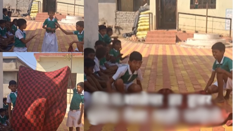 व्हिडीओमध्ये पाहू शकता की, शालेय गणवेश परिधान केलेले काही विद्यार्थी जमिनीवर बसले आहे तर तीन विद्यार्थी उभे राहून जादू दाखवत आहे. दोन विद्यार्थी जमिनीवर दोन पायांवर अधांतरी बसले आहेत आणि त्याच्यासमोर एक चादर आहे. एक छोटा चिमुकला त्यांच्या समोर उभा आहे. त्यानंतर दोन्ही बाजूने चादर पकडून दोघंही उभे राहतात आणि जोरजोरात चादर हलवतात त्यानंतर मागे असलेला चिमुकला दिसत आहे. त्यानंतर पडदा पडतो आणि चिमुकला गायब होतो आणि दूर असलेल्या वर्गाच्या खिडकीत उभा असल्याचे दिसतो. चिमुकल्यांची जादू पाहून सर्वजण टाळ्या वाजवतात.