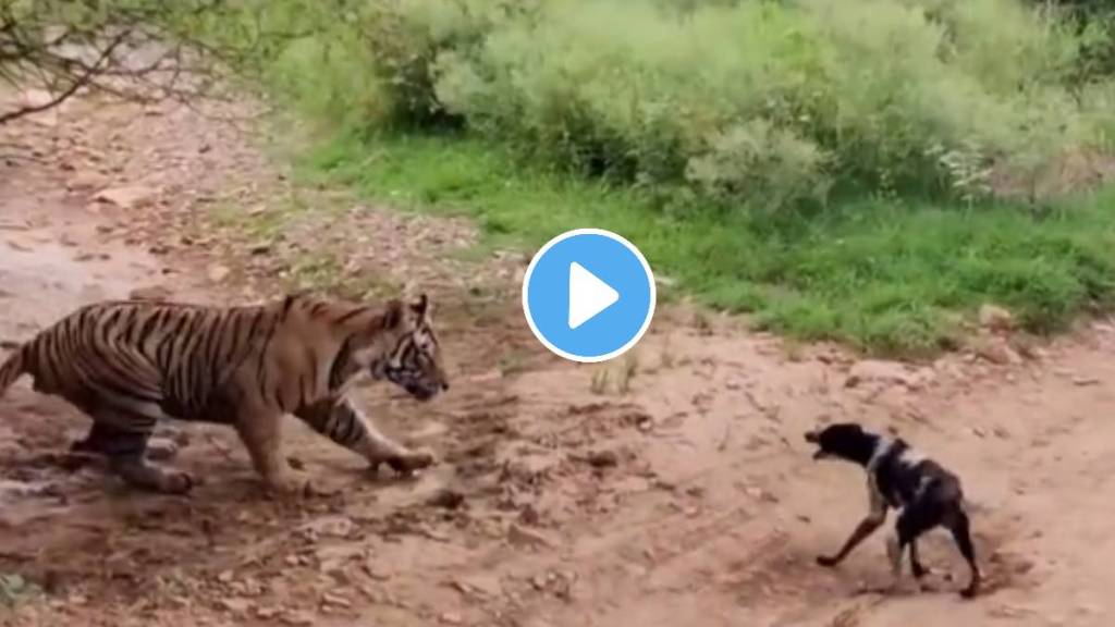 वाघ विरुद्ध कुत्रे वाघ किंवा सिंह यासारख्या प्राण्यांशी झुंज देणाऱ्या आणि त्यात यशस्वी होणाऱ्या प्राण्यांचे अनेक व्हिडिओ आपण पाहतो. या व्हिडीओमध्ये तुम्ही पाहू शकता, रस्त्याच्या कडेला वाघ झोपलेला आहे. यावेळी तिथून एक छोटासा कुत्रा जात आहे, तेवढ्यात वाघाला अंदाज येतो आणि वाघ कुत्र्यावर झडप घालतो. वाघाने पटकन या कुत्र्याच्या मानेला पकडलं आणि तो तिथून निघून गेला. वाघाने काही सेकंदातच कुत्र्याचा जीव घेतला. श्वानाने वाघाच्या तावडीतून सुटण्यासाठी बरीच धडपड केली. मात्र, त्याला यात यश मिळालं नाही. वाघाने कुठलाही त्रास दिला नसताना उगाच जाऊन त्यांच्याशी पंगा घेण्याची प्रवृत्ती प्राण्यांमध्ये आढळत नाही.