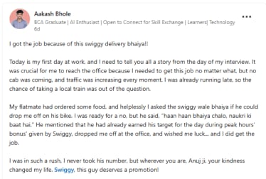 आकाशने नाही ऐकण्याची तयारी केली होती. पण, “हो, हो, भाऊ, चला जाऊया, हे तर माझं काम आहे” असं तो अगदी सहज म्हणून त्याने आकाशला ऑफिसमध्ये सोडले आणि शुभेच्छा दिल्या. त्यानंतर आकाशने मुलाखत दिली आणि त्याला नोकरी सुद्धा मिळाली. आकाश इतक्या घाईत होतो की, डिलिव्हरी बॉयचा नंबर घेऊ शकला नाही. पण, त्याने पोस्टमध्ये कृतज्ञता व्यक्त करत “अनुज जी, तुम्ही कुठेही असलात तरी, तुमच्या दयाळूपणाने माझे आयुष्य बदलले. स्विगी, हा माणूस बढतीस पात्र आहे” ; अशी पोस्ट त्याने लिहिली आहे.