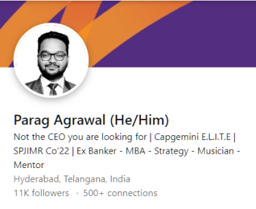 सोशल नेटवर्किंग साइट लिंक्डइनवर पराग अग्रवाल अशा अकाऊंटवरून केलेली एक पोस्ट सध्या सर्वांचे लक्ष वेधून घेत आहे. हे अकाउंट ट्विटरचे माजी सीईओ पराग अग्रवाल यांचे नसून बँक कर्मचारी पराग याचे आहे. ट्विटरच्या सीईओ पदावरून पराग अग्रवाल बाहेर पडताच लिंक्डइनवर अनेकांनी त्यांचे नाव शोधण्यास सुरुवात केली असावी यामुळे बँकर पराग अग्रवाल यांच्या प्रोफाईलच्या व्ह्यूजमध्ये तब्बल ३६ टक्के वाढ झाली आहे. लोकांचा हा गोंधळ पाहातच स्वतः बँकर अग्रवाल याने पोस्ट लिहिली आहे.