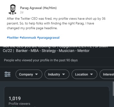 बँकर पराग अग्रवाल याने “लोकांना योग्य पराग शोधण्यात मदत करण्यासाठी…” अशा कॅप्शनसहित ही पोस्ट केली त्यानंतरही अनेकांचा गोंधळच होत होता, शेवटी परागने आपला लिंक्डइन प्रोफाईलचा बायो बदलून “मी तुम्ही शोधत असलेला सीईओ नाही”, असे लिहिले आहे.
