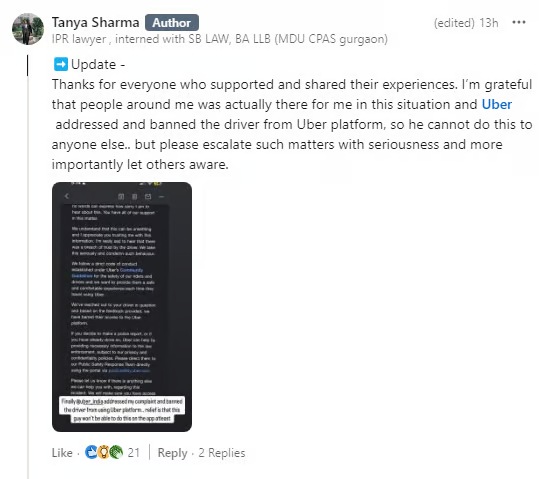 वाढत्या दबावामुळे आणि टीकेमुळे अखेरीस उबरने आरोपी ड्रायव्हरला त्याच्या प्लॅटफॉर्मवरून बंदी घातली. तान्याने एक फॉलो-अप पोस्टमध्ये तिची कृतज्ञता व्यक्त केली, “ज्यांनी मला पाठिंबा दिला आणि त्यांचे अनुभव शेअर केले त्या प्रत्येकाचे आभार. या परिस्थितीत माझ्याबरोबर लोक आसल्याने मी कृतज्ञ आहे. उबरने आता या समस्येकडे लक्ष वेधले आहे आणि रायडरवर बंदी घातली आहे, याची खात्री करून की तो हे वर्तन इतर कोणाशीही करू शकत नाही. तथापि, मी सर्वांना विनंती करते की जर अशा गोष्टी कोणाबरोबर घडल्या तर लगेच अॅक्शन घ्यावी आणि या समस्यांबद्दल जागरूकता वाढवावी.”