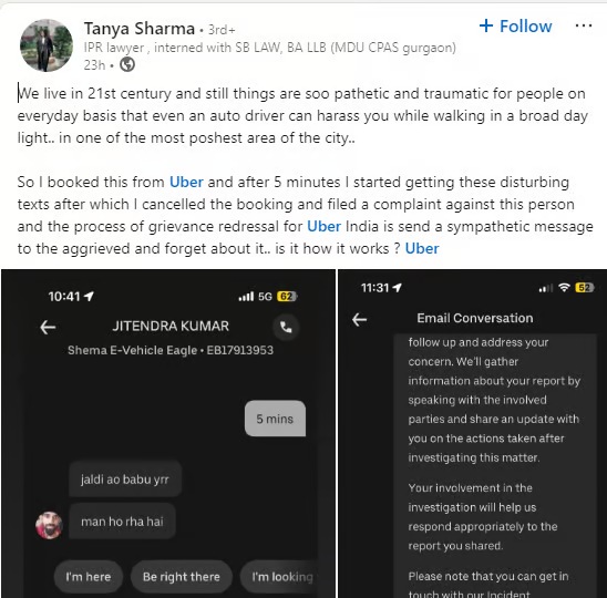 तान्याने याबाबत लिंक्डइनवर पोस्ट शेअर केली आणि लिहिलं, “आपण २१ व्या शतकात राहतो आणि तरीही लोकांसाठी दररोज गोष्टी इतक्या दयनीय आणि क्लेशकारक आहेत की एक ऑटो ड्रायव्हरदेखील तुमचा भरदिवसा छळ करतो, तुमच्याशी अश्लील वर्तन करतो. मी उबर ऑटो बुक केली आणि पाच मिनिटांतच मला त्रासदायक मेसेज येऊ लागले. मी बुकिंग रद्द केले आणि तक्रार दाखल केली, परंतु उबर इंडियाच्या तक्रार निवारण प्रक्रियेमध्ये पीडितेला सहानुभूतीपूर्ण संदेश पाठवणे आणि नंतर ते विसरणं समाविष्ट आहे असं दिसतं. हे असंच काम करतं का?”