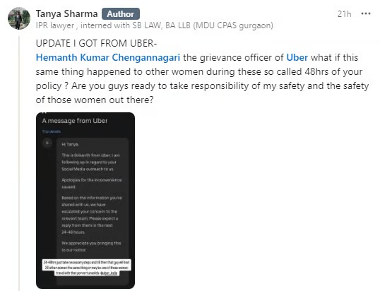 ही घटना ऑनलाइन मोठ्या प्रमाणावर व्हायरल झाली आणि यामुळेच अनेकांनी या महिलेच्या तक्रारीवर जलद कारवाई न झाल्याबद्दल संताप व्यक्त केला. तान्याने नंतर उबरचे तक्रार अधिकारी हेमंत कुमार चेंगननगरी यांच्याकडून मिळालेल्या प्रतिसादाबद्दल अपडेट शेअर केले. तिने कंपनीच्या दृष्टिकोनावर प्रश्नचिन्ह उपस्थित केले आणि विचारले, “तुमच्या पॉलिसीच्या या तथाकथित ४८ तासांच्या कालावधीत इतर महिलांच्या बाबतीत असेच घडले तर? तुम्ही माझ्या सुरक्षिततेची आणि तेथील महिलांच्या सुरक्षेची जबाबदारी घेण्यास तयार आहात का?”