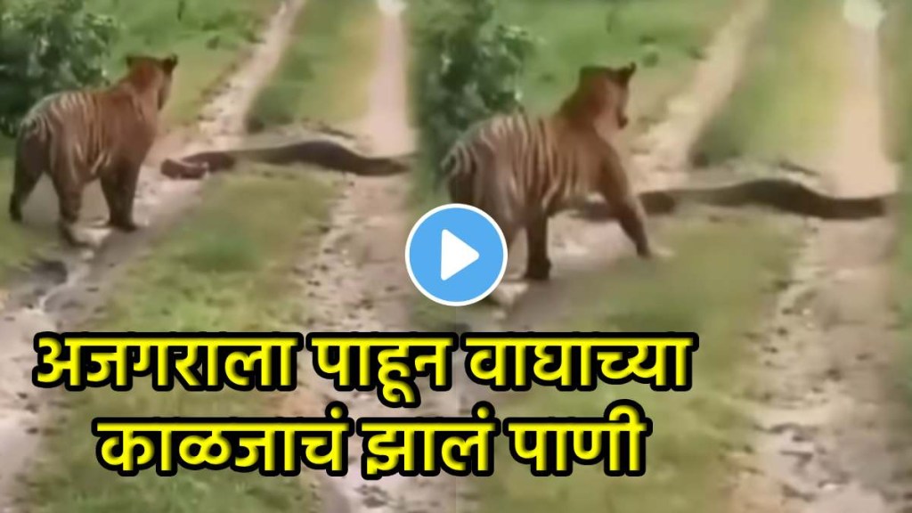 सोशल मीडियावर प्राण्यांचे असे विविध व्हिडीओ आपल्याला पाहायला मिळतात; ज्यातील बरेचसे व्हिडीओ थरराक, तर काही व्हिडीओ मजेशीरही असतात. जंगलातील प्राण्यांचे व्हिडीओ म्हटल्यावर युजर्सही ते आवडीने पाहतात. कारण- त्यातील अनेक गोष्टी आपल्यासाठी कधीही न पाहिलेल्या किंवा अधिक माहिती मिळवून देणाऱ्या असतात. दरम्यान, आता एका वाघाचा एक असा व्हिडीओ समोर आला आहे; ज्यात तो चक्क एका भल्या मोठ्या अजगराला घाबरल्याचे दिसत आहे.
