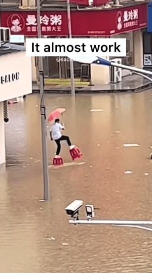 या व्हिडीओत आपण पाहू शकतो की, एक माणूस छत्री घेऊन रस्त्यावर तुडुंब भरलेल्या पाण्यात चालतोय. पण, या सगळ्यात पाय आणि शूज स्वच्छ राहावेत यासाठी या गृहस्थानं आपल्या पायांनाच दोन टेबलं बांधून घेतल्याचं आपण पाहू शकतो. एक एक पाऊल सावकाश पुढे टाकत, तो त्या पाण्यातून चालताना दिसतो. इतक्यात एका टेबलावरून त्याचा पाय घसरतो आणि तो छत्रीसकट खाली कोसळतो.