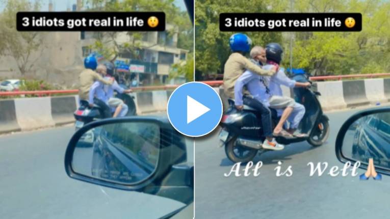 या व्हिडीओमध्ये ३ जण एका स्कूटीवर एकमेकांना चिपकून बसले आहेत असे दिसते. यातील २ जणांनी हेल्मेट घातले आहे. हेल्मेट घातलेल्या दोन माणसांच्या मध्ये एक वयस्कर आजोबा बसलेले आहेत. सर्वात मागे बसलेल्या व्यक्तीने स्कूटी चालवणाऱ्याच्या खांद्यांवर दोन्ही हात ठेवले आहेत. तर मध्ये बसलेल्या आजोबांनी स्कूटीचा मागचा स्टॅंड पकडला आहे. त्यांच्याकडे पाहून ३ इंडियट्स मधल्या सीनची आठवण येते, ज्यात रॅन्चो आणि प्रिया स्कूटीवरुन राजूच्या वडिलांना डॉक्टरांकडे घेऊन जात असतात.