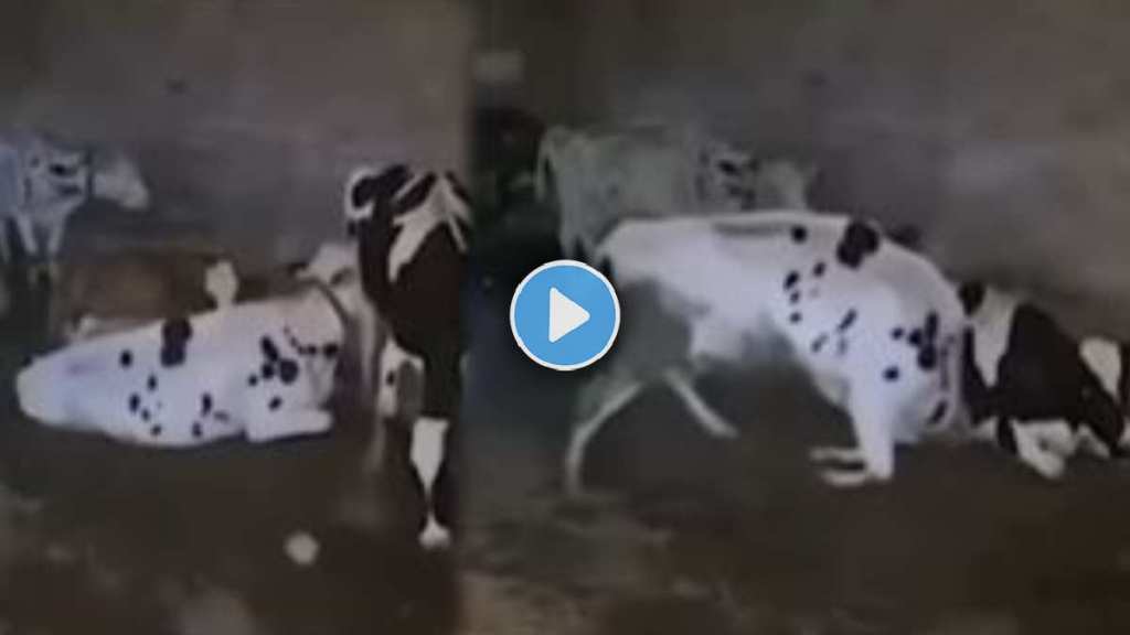 हा व्हायरल व्हिडीओ एका गोठ्यातील असून यावेळी गोठ्यामध्ये पाच गाईंना बांधलेले दिसत आहे. यावेळी या पाच गाईंच्या मध्यभागी असलेली एक पांढऱ्या रंगाची गाय खाली बसून चारा खात असताना अचानक त्या गाईच्या बाजूला उभी असलेली काळ्या रंगाची गाय तिच्या डोक्यावर बसते, ज्यामुळे पांढऱ्या गाईला उठता येत नाही. अनेक प्रयत्न करून ती गाय उठते, पण यावेळी तिच्या डोक्याच्या भागावर काळी गाय बसल्यामुळे तिला तिचं डोकं काढणं कठीण होतं. शेवटी पांढरी गाय जागीच जमिनीवर कोसळते. हा व्हिडीओ पाहून अनेक जण कमेंट्समध्ये गाईंना बसण्यासाठी या गोठ्यात व्यवस्थित जागा नसल्याचे म्हणताना दिसत आहेत.
