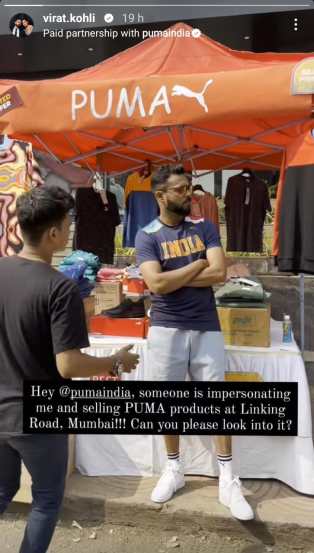विराट कोहलीने इंस्टाग्राम स्टोरी मध्ये बांद्रा येथील प्रसिद्ध शॉपिंग स्ट्रीट म्हणजेच लिंकिंग रोड येथील एक फोटो शेअर केला आहे. या फोटोत Puma कंपनीच्या नावाचा एक स्टॉल असून तिथे एक व्यक्ती कोहलीचा लुक कॉपी करून उभा असल्याचे दिसत आहे. कोहली हा पुमाचा अधिकृत अँबेसेडर आहे, तो आपल्या इंस्टाग्रामवरून अनेकदा पुमा उत्पादनाची जाहिरात करत असतो. पण कोहलीने आज शेअर केलेल्या फोटोमधील व्यक्ती कोहलीचा लुक करून इतरांना खोटे पुमाचे शूज विकत आहे त्यामुळे कोहलीने यासंदर्भात तक्रार करून पुमाला या प्रकरणी लक्ष घालण्याचा सल्ला दिला आहे.
