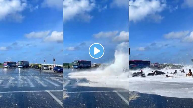 प्रत्यक्षात व्हायरल होत असलेला हा व्हिडिओ मालदीवचा आहे. समुद्राला लागून असलेल्या रस्त्यावर मोठ्या प्रमाणात वाहने धावत असल्याचे या व्हिडिओमध्ये दिसत आहे. केवळ कार आणि बसच नाही तर अनेक दुचाकीही रस्त्यावर धावत आहेत. रस्त्याच्या कडेला एक महासागर आहे, जिथून उंच लाटा उसळत आहेत. सर्व वाहने आपापल्या मार्गाने जात असताना समुद्रातून ‘मृत्यू’ची भीषण लाट उसळली. या लाटेमुळे रस्त्यावरून पायी जाणारे लोक आणि दुचाकीस्वार अचानक वाहून जाऊ लागले. अर्ध्याहून अधिक लोकांना काय झाले हे काही काळ समजू शकले नाही.
