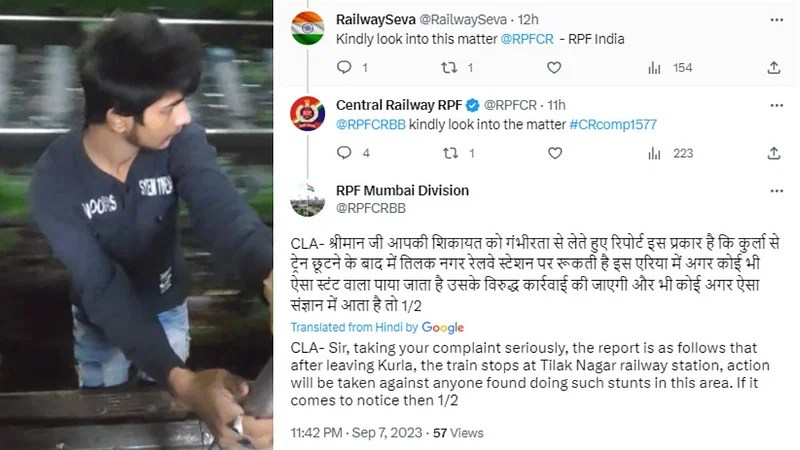 तरुणाचा हा खतरनाक व्हिडीओ व्हायरल होताच सेंट्रल रेल्वे आरपीएफकडून या घटनेची दखल घेण्यात आली आहे. ट्रेन तिळक नगर रेल्वे स्टेशनवर पोहोचल्याचं रेल्वे पोलिसांच्या निदर्शनास आलं. त्यानंतर पोलिसांनी या ट्वीटवर रिप्लाय देत म्हटलं, या विभागात कोणत्याही प्रवाशाने ट्रेनमध्ये स्टंटबाजी करण्याचा प्रयत्न केला, तर अशा लोकांविरोधात कडक कारवाई केली जाईल.