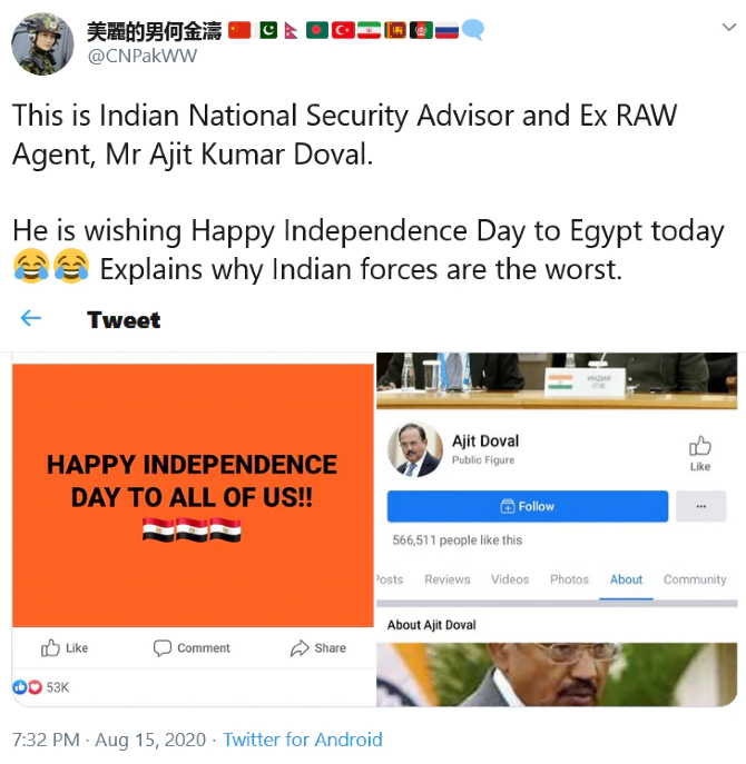 मात्र इंडिया टुडेच्या अॅण्टी फेक न्यूज वॉर रुमने केलेल्या फॅक्ट चेकसंदर्भातील तपासणीमध्ये स्वातंत्र्यदिनानिमित्त इजिप्तचा राष्ट्रीय ध्वज पोस्ट करत देण्यात आलेल्या शुभेच्छा या अजित डोवाल यांच्या फॅन पेजवरील असल्याची माहिती समोर आली आहे. डोवाल यांचे एकही अधिकृत सोशल नेटवर्किंग हॅण्डल नाहीय. मात्र त्यांच्या फॅन पेजवरुन केलेल्या पोस्ट व्हायरल झाल्या आहेत. फेसबुकवरील व्हायरल पोस्ट पाहण्यासाठी तुम्ही येथे क्लिक करु शकता.