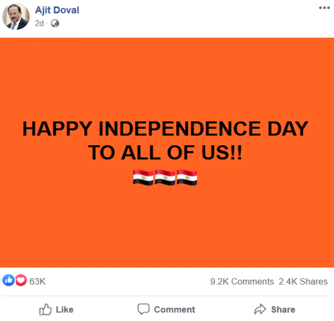 त्यामुळेच डोवाल यांनी इजिप्तचा झेंडा पोस्ट करत भारतीयांना स्वातंत्र्यदिनाच्या शुभेच्छा दिल्याचा दावा खोटा असल्याचे सिद्ध होत आहे. व्हायरल होणार पोस्ट एक फॅन पेजने केली असून डोवाल यांचे कोणतेही अधिकृत अकाऊंट नसल्याने त्यांचा या पोस्टशी काहीही संबंध नसल्याचे सिद्ध होत आहे.