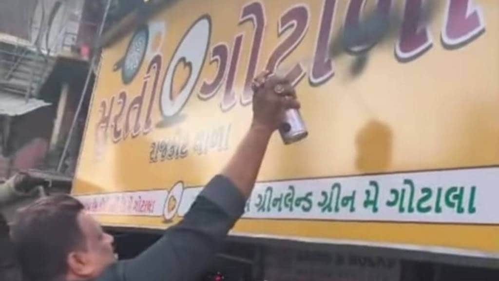 भाईंदर : मिरा रोड परिसरात एका खाद्यपदार्थ विक्रेत्याने मराठीऐवजी थेट गुजराती भाषेत दुकानाची पाटी लावल्याचा प्रकार समोर आला आहे. यामुळे संतप्त झालेल्या महाराष्ट्र नवनिर्माण सेनेच्या कार्यकर्त्यांनी संबंधित पाटीवर काळे फासून निषेध व्यक्त केला. मिरा-भाईंदर शहरात मराठी-अमराठी भाषेच्या मुद्द्यावर मागील काही वर्षांपासून अधूनमधून वाद निर्माण होत आहेत. त्यामुळे शहरातील वातावरण शांत राहावे यासाठी प्रशासनाकडून सातत्याने प्रयत्न केले जात आहेत.
