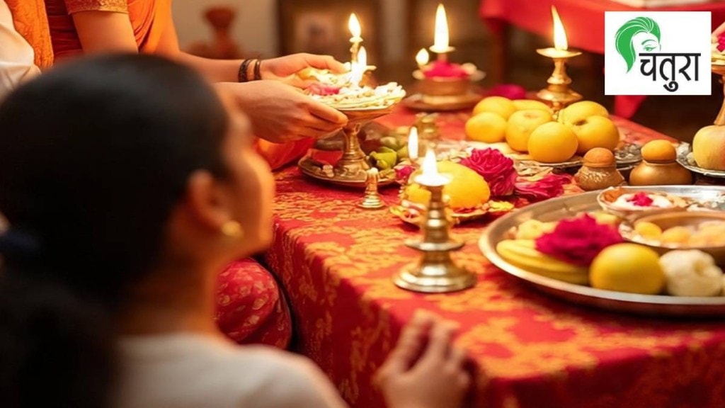 рдЧреГрд╣рд┐рдгреА рд╕рдВрдзреНрдпрд╛рдХрд╛рд│реА рдирдКрд╡рд╛рд░реА рд▓реБрдЧрдбрдВ рдиреЗрд╕реВрди рдХреЗрд╕рд╛рдВрдЪреНрдпрд╛ рдЖрдВрдмрд╛рдбреНрдпрд╛рд╡рд░ рд╡реЗрдгреА рдорд╛рд│реВрди, рдирд╛рдХрд╛рдд рдЪрд╛рдВрдЧрд▓реА рдард╕рдард╢реАрдд рдирде, рдПрдЦрд╛рджрд╛ рдареЗрд╡рдгреАрддрд▓рд╛ рджрд╛рдЧреАрдирд╛ рдШрд╛рд▓реВрди рд╕рдВрдзреНрдпрд╛рдХрд╛рд│реА рддреАрд░реНрде рдкреНрд░рд╕рд╛рджрд╛рд▓рд╛ рдпреЗрдгрд╛рд▒реНрдпрд╛ рдкреИ рдкрд╛рд╣реБрдгреНрдпрд╛рдВрдЪреЗ рд╕реНрд╡рд╛рдЧрдд рдХрд░рд╛рдпрд▓рд╛ рд╕рд┐рджреНрдз рд╡реНрд╣рд╛рдпрдЪреА.